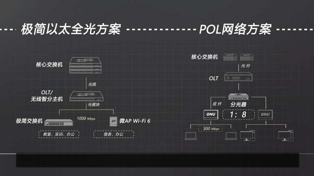学校在实际的使用中看到了光纤之于铜缆的明显优势,这也是学校率先采用全光网的原因。“早在六年前,轻化工就已经计划建设全光校园网。”随着“光进铜退”的风潮,光网络从家用走向了企业级市场。而彼时的全光网方案,也就是POL方案比较简单和原始,脱胎于家用方案,难保在企业级园区网会“水土不服”。