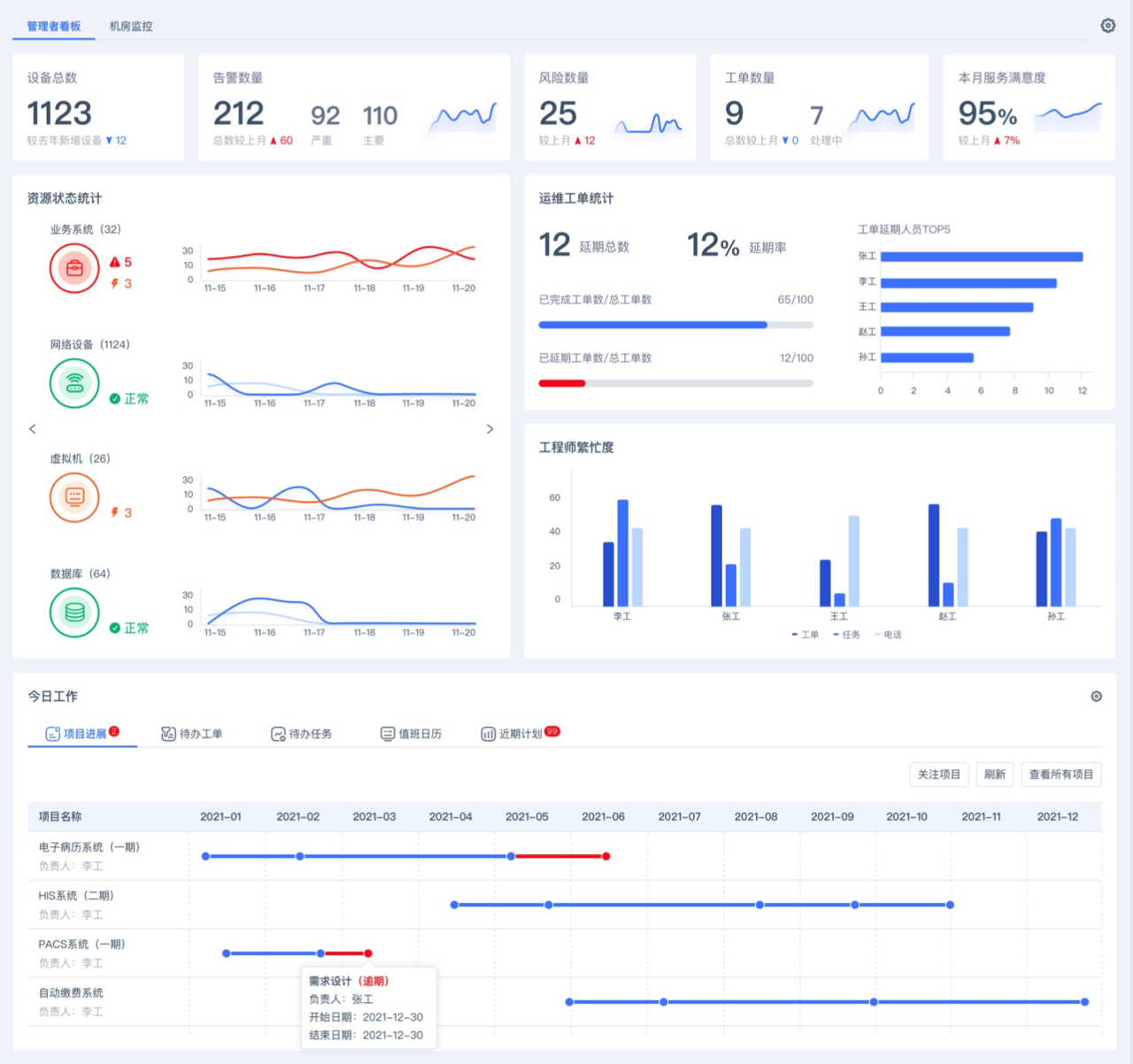 平台为不同角色运维管理人员提供了个性化的工作中心搭建能力,帮助运维工程师实现登录即工作的便捷,同时为管理者带来掌控全局的管理驾驶舱。