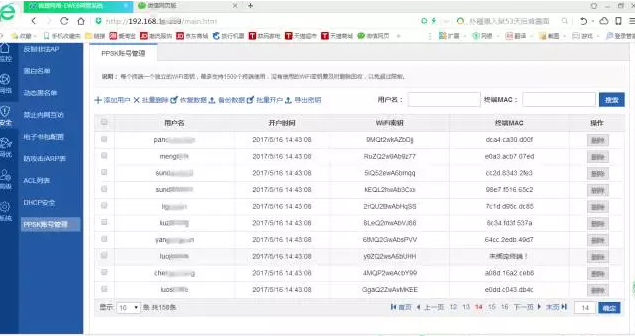 部署好后,负责网络的小陈在控制器的EWEB页面上,给所有的员工分配了P-PSK帐号,供员工接入认证。员工接入后,后台自动记录了终端的MAC地址和密码的对应关系,如下图所示。