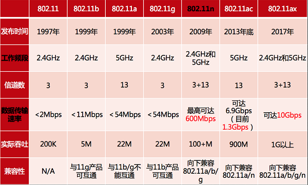 这些协议最大的区别在于速率的提升。在802.11g之前,最大的速率是54兆,而到了802.11n,一些关键技术的使用使最大速率提升到 600M。后来发展到802.1ac,速率可以达到6.9G。到了现在的802.11ax,可以达到10G。