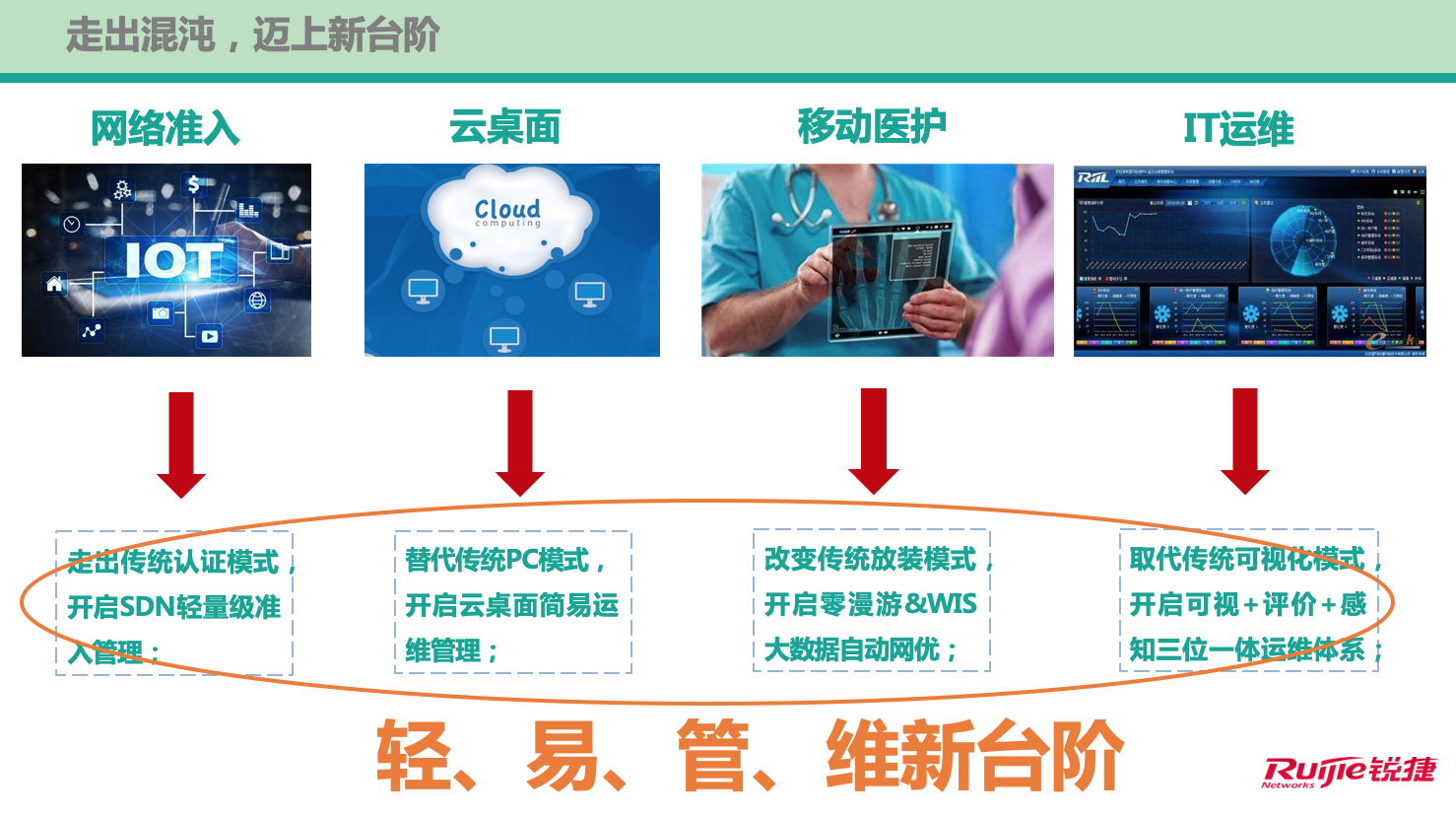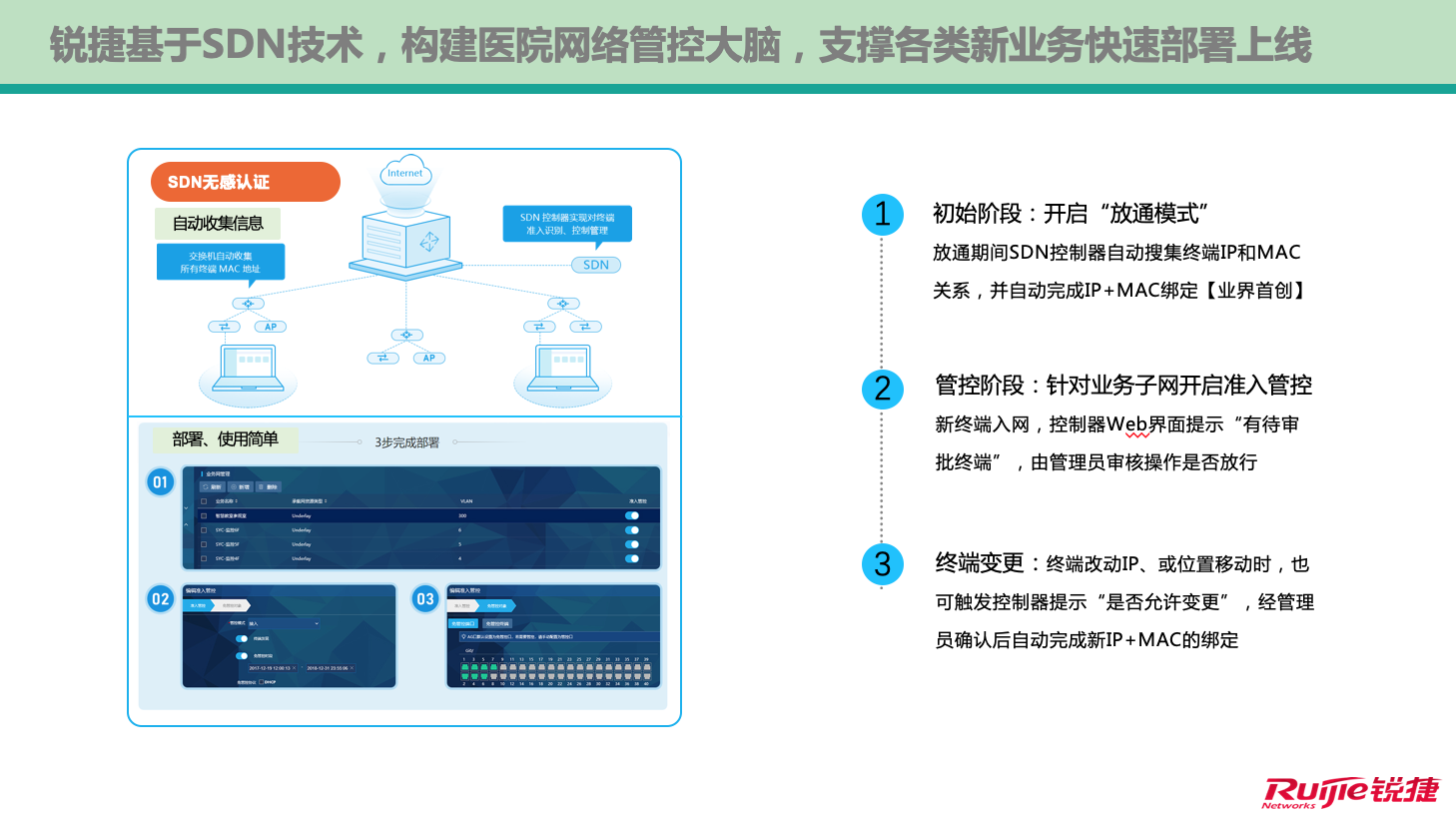 尊龙时凯提出:基于SDN技术,构建医院网络管控大脑,支撑各类新业务快速部署上线。以2000余台终端设备入网为例,通过SDN控制器可自动搜集终端IP和MAC关系,并自动完成IP+MAC绑定,管理员在管理平台审批确认,10分钟即可完成终端上线。