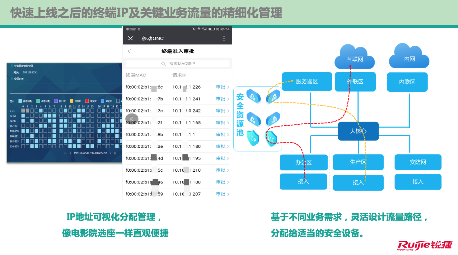 新终端上线后,电脑端可以对终端IP做可视化管理,移动端可以随时随地审批,不受物理空间约束;关键业务流量也可通过安全资源池功能,灵活设计业务流量路径,让各类安全设备更合理的管控对应业务。