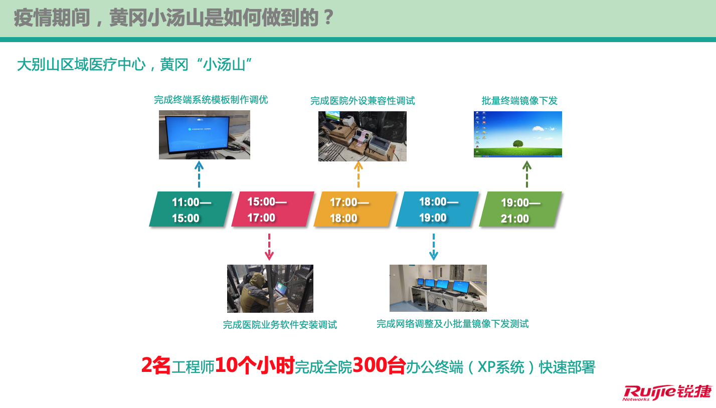 办公终端作为医护人员的“核心操作工具”,以及多种外设的“链接器”,保障它们快速上线且满足各类应用需求,同时还需要使用方日常无感知故障存在。这背后,往往是跑断腿,手速快的运维人员。现在,云技术的应用,让基于云架构的桌面终端成为办公终端的新宠,上线快、兼容性强、管控便利、运维简化,这些特点都能让桌面运维人员告别忙碌的“扫楼”等现象。究竟云桌面的部署速度能有多快呢?我们一起来看疫情期间,黄冈小汤山的桌面部署速度。
