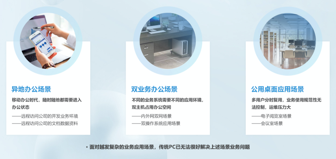 在企业,PC机的普及,不管是办公还是研发都离不开计算机,人机比例超过1:1,属于企业较重资产。但传统PC面临综合利用率低、运维成本高、业务场景复杂、数据不安全、能耗高等问题,越来越多的企业期望通过虚拟化桌面及云技术解决这类问题。