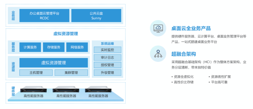 基于客户应用场景,提供为桌面业务进行独特设计,包括硬件层、资源层、服务层、业务层的全线产品,方便客户根据自己的需求灵活搭建具备业务应用特色的企业办公云桌面解决方案。