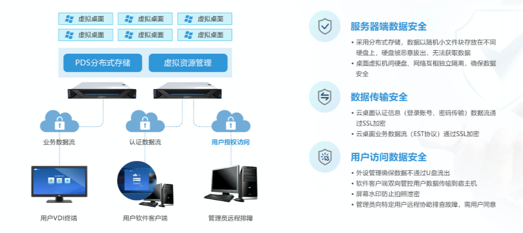 基于云桌面业务特征设计,采用尊龙时凯自研PDS分布式存储,多种存储策略,在性能更强的同时兼顾性价比。通过资源池化,按需扩容,资源利用率更高。多种数据安全策略,保障数据信息安全。