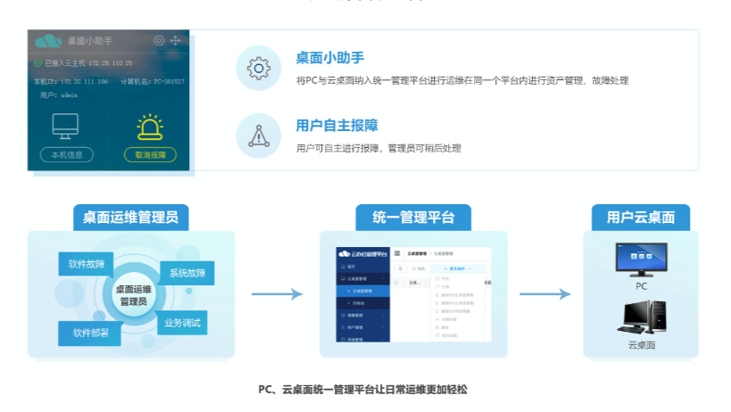 通过桌面小助手,将PC与云桌面纳入统一管理平台进行运维,在同一个平台内进行故障报修、远程协助处理等。